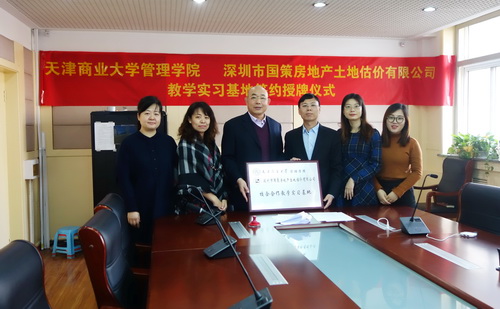 1月14日,管理学院与深圳市国策房地产土地估价有限公司“校企合作教学实习基地”签约授牌仪式在学院210会议室举行。国策机构华北区副总经理天津分公司负责人阮宗斌、华北区技术副总监李红艳和行政人事专员张雪、管理学院院长王庆生、工程管理系主任宋海风出席。副院长宗毅主持仪式。