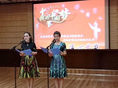 比赛中,参赛同学们以铿锵有力的气势,充沛饱满的感情,自信大方的形象,展现了天商学子奋发图强、朝气蓬勃、积极向上、爱国爱党的青春风貌,特别是来自管理学院的学生古丽、祖木来提古丽·艾尼瓦尔两名同学带来的作品《外侮需人御齐心赴采薇》,赢得评委和同学们的阵阵掌声。