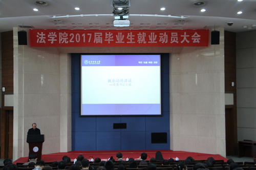 10月14日下午,法学院2017届毕业生就业动员大会在图书馆国际报告厅举行。学院全体领导、系主任、辅导员出席大会,2017届全体毕业生参加,大会由学院党委副书记刘桂涛主持。