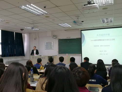 10月26日下午,第一次实战教育入学讲座在第四教学楼202多媒体教室展开,MPACC校外导师焦文军博士为大家讲解《从普通到卓越---解析CFO的奋斗成长之历程》,讲座由MPACC负责人王晓艳教授主持,MPACC专业2016级全体研究生参加。