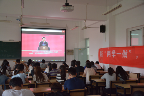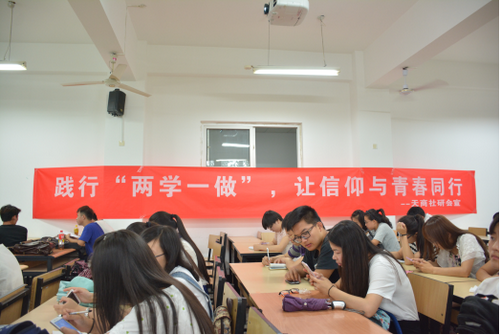 6月28日下午, 必赢官网大学生中国特色社会主义理论体系学习研究会在三教214举办 “践行两学一做,让青春与信仰同行”大学生党员教育,各学院分会近50名主要学生干部、党员参加。