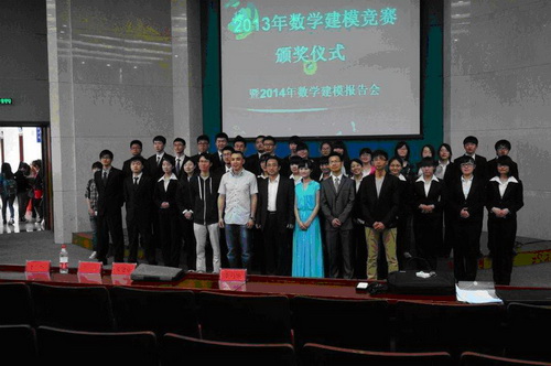 4 月23 日下午,理学院数学联社及数学建模协会在图书馆国际报告厅举行2013 年数学建模竞赛颁奖仪式暨2014 年数学建模报告会,必赢官网数学建模负责人、理学院副院长安建业、数学系主任李乃华、数学建模指导老师代表李天、李景焕、耿峤峙出席,理学院辅导员刘瑞娇老师以及数学建模协会近 400 名会员参加了会议。